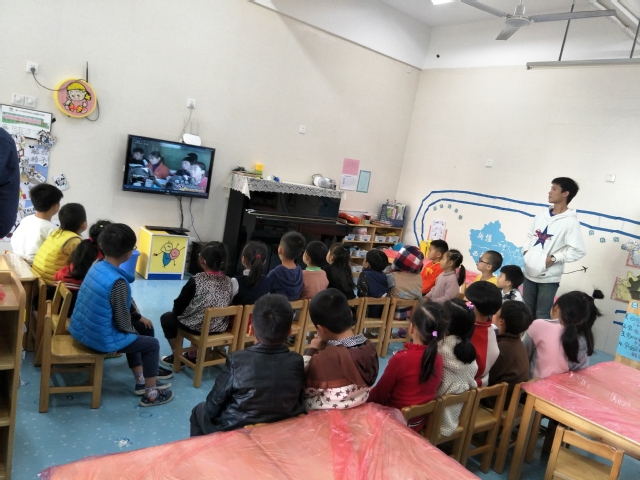 15点30分,随着志愿者们的自我介绍,融入小天使们的课堂。志愿者们通过给小朋友们观看有关贫困山区的小视频,进行提问互动,画下爱等方式,去帮助小朋友们了解到青海的孩子们需要温暖。首先“如果通过绘画传递爱,你会画下什么来给予青海小朋友们温暖?”等问题激发小朋友的思维,小朋友们踊跃地举手发言,畅所欲言。最后,志愿者蹲下来和孩子们一起看世界,让孩子们画出给予青海孩子们的爱,这些作品将在后期将制作成明信片寄出。
