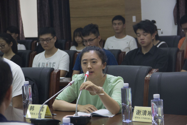 然后是韩雪老师发言。韩雪老师希望大家能顺利完成从本科生到研究生的角色转变,在后续的时间里和导师相处融洽,相得益彰,跟周围的同学也打成一片,交到志同道合的好朋友。研究生工作部会是大家坚实有力的后盾,祝愿大家在两个学校都生活得幸福无比,学业有成。