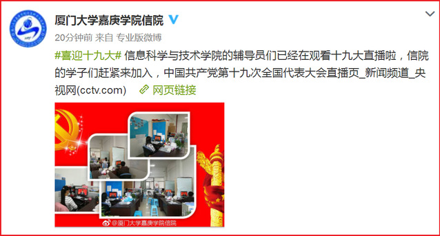 同时,信息科学与技术学院的官方微博发起#喜迎十九大#话题,带动信息科学与技术学院的学子们一起观看十九大直播,积极参与互动,不仅充分了解十九大的主要内容,更深入了解党地路线、方针和政策,坚定不移跟党走,引导学生们做中国特色社会主义的合格建设者和可靠接班人。