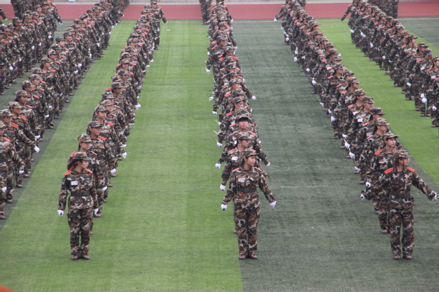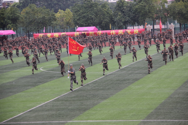 当同学们还在回味匕首操方队的精彩表演时,突然喊杀声震天,军体拳方队的同学们呐喊着冲进场内他们动作整齐、沉着有力,展示了我校学生的青春风采。他们“杀”声响亮、威震四方,展现了17新生的勃勃生机。弓步冲拳,弓步稳如钟,冲拳利如锋。穿喉弹踢,敏锐的反应,迅速的弹踢。马步横打,内拨下勾,由内向外,勾拳有力,交错侧踹,斜方侧踹,重心左移外格横勾,格挡反击,横勾反击,一套一套的动作孔武有力,气贯长虹,看得人眼花缭乱,目不暇接。看台上爆发出热烈的掌声。