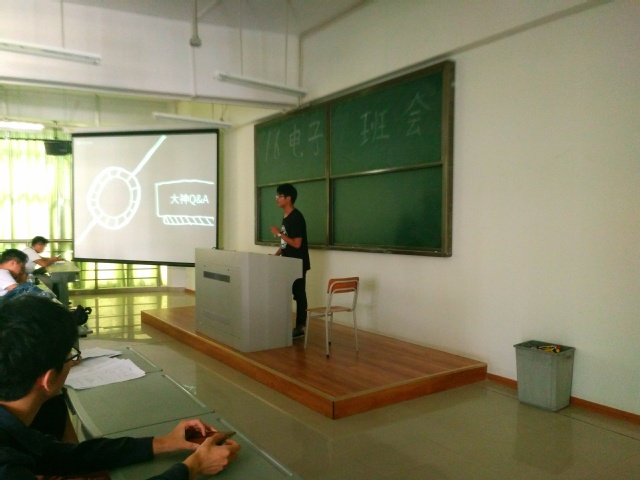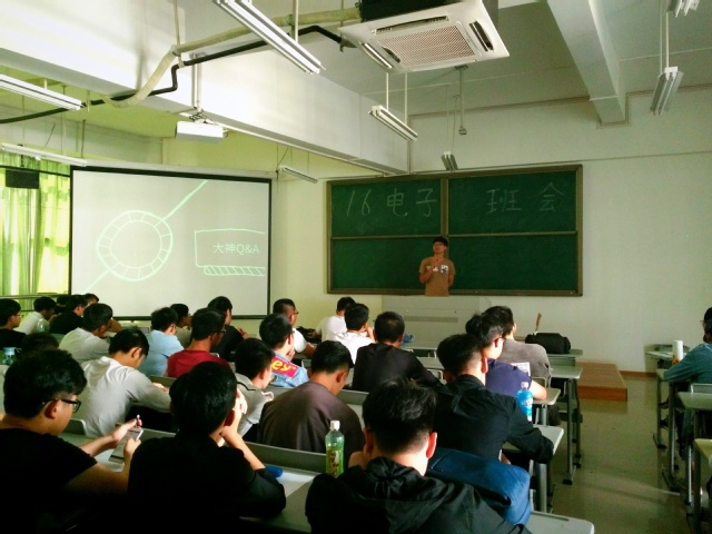 此次班会以总结过去,认清自己的不足并梳理新学期目标为主要讨论话题,旨在为同学们解决未来可能面临的生涯道路的选择问题。本次班会由班长洪嘉一主持,并以其对大一16电子集体活动的回顾为开端,让大家重新了解到大一生活与学习上的那些点点滴滴。随后,为了更好的让大家在大二能有新的收获,本次班会特地邀请了14级光电专业的学长:陈晓龙,以及14级电子专业的学长:陈剑平。两位学长作为过来人,分别为大家讲述了来到嘉庚后的大体生活与学习方向。陈晓龙学长,在全国智能车与电子设计大赛上都取得骄人成绩,他强调:“我知道你们有很多人也加入了智能车和其他的一些队伍,其实我大一跟很多人一样,什么都不会,但我大二开始对比赛产生兴趣,为了比赛在实验室待到半夜,有努力就会有回报。”另外,作为全国电子作品设计竞赛一等奖的得主,陈剑平学长分享了他一路走来的历程,当说到去西安复试期间,在那边旅游以及吃当地美食的时候,大家都响起了羡慕的声音。在羡慕的同时,大家也开始正视自己的这接下来的大学学习生活,是否,我们也能有着拿的出手的成果。接下来,16电子助导裴俊智学长就个人简历,希望我们能有明确的目标,“所谓术业有专攻,你们下定决心要在哪方面下功夫,就要一直坚持下去。”