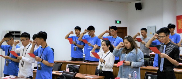 最后,在会场的一阵掌声中,开始了授牌仪式。团委全体干事起立,部长助理们一一将手中的工作牌为每一位团委干事佩戴上。台上的灯光绚烂,打在每个人的身上,恍惚之间充满了一种庄严的仪式感,交接的是一份责任,一份担当。所有干事的腰板挺得更直了,举起右拳,缓缓道出誓词: