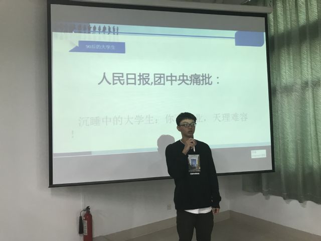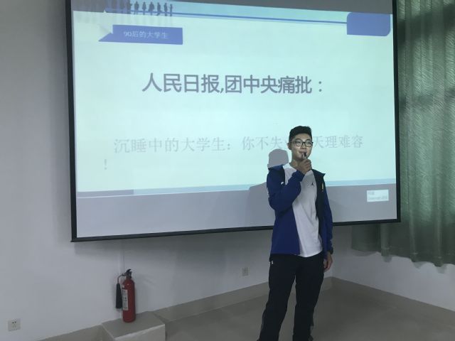 会议开始,班长王韬走上讲台,向大家说道:“同学们,下面让我们看一些图片”。紧接着,一张张当今大学生整天打游戏、喝酒、抽烟的图片引入大家眼帘,原来嘻嘻哈哈的教室一下就没了声音。最后,王韬点开了中国人民日报的一篇头版文章——《沉睡的大学生,你不失业,天理难容!》。停顿片刻,王韬开口:“不知道大家看完这些图片和文章后心里有什么感想,但对于我来说,心里确实挺不是滋味的。大学生遭到这样的批评,对于我们整个学生团体都是一种耻辱和遗憾。”