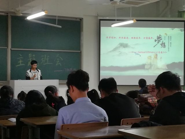 接下来,刘挺同学上台发言,直言当代大学生对学习不够重视的浮躁心理,谈古论今,引用《大学》中的诗句,从古代——当代的角度深度阐释了一个合格的大学生应该具备的基本条件。刘挺同学的讲话醍醐灌顶,赢得了全班热烈的掌声。
