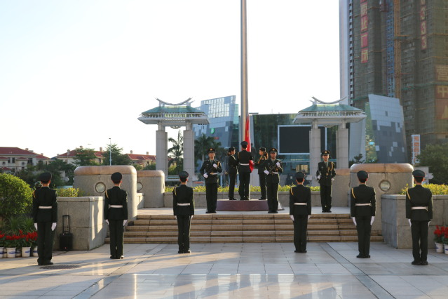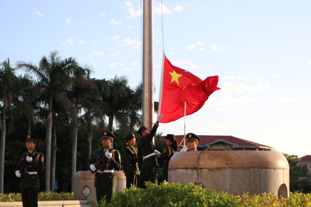 身着军礼服的升旗班由一名擎旗手,两名护旗手,一名执行队长以及六名队员组成,在执行队长拔剑出鞘声中所有人变正步前进,走到国旗杆边,护卫队员散开站定,全场肃静,升旗仪式开始。