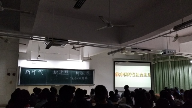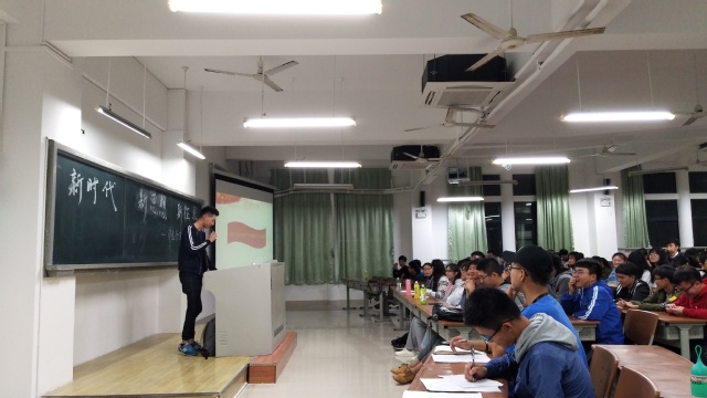 首先展示的是第一个环节,由通识教育部张宽前老师以PPT的形式进行十九大报告的解读。张老师主要从“决胜全面建成小康社会,夺取新时代中国特色社会主义伟大胜利”和“解决台湾问题”两个方面讲解十九大坚持以一个中国为原则、坚定不移走有中国特色社会主义道路。接着,第二个环节王振同学通过视频向同学们展示了“习近平描绘的新时代”,并结合PPT介绍了国家过去五年的工作回顾以及新时代的历史革命、基本方略和中国特色。最后,第三个环节由同学们上台畅谈在团课后对新时代精神的认识和看法。
