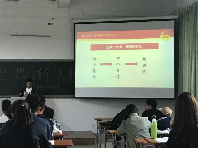 团课开始,初群易同学先为大家总结了十九大的主要举措和习近平主席的重要讲话,尤其是对当代大学生的的期望和要求,然后再为大家讲述了中国共产党从无到有、从扎根农村到领导全中国走向解放、走向胜利的艰苦征程。随后,初群易向同学们提出了几个问题,让同学们来进行回答。