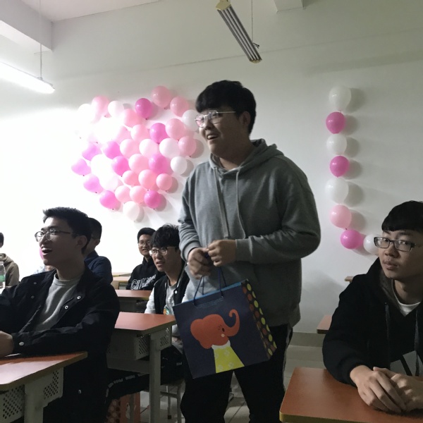 一出寝室楼,少女们心中便微微一动,笃行楼所对的博学楼前正挂着男孩们精心准备的横幅,上面写着”沉鱼之貌,落雁之姿,女神风华绝代。一笑倾城,再笑倾国,信科祸国殃民。”当少女们推开教室大门,眼中所见的便是手持玫瑰,盛装打扮迎接着她们的男孩们。而在班级后方的白墙上,更是用气球贴了I ♡ U的字样,整个教室都充满了青春和浪漫的气息。