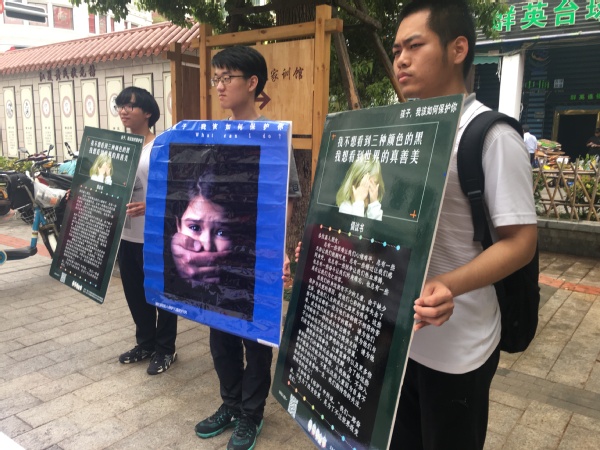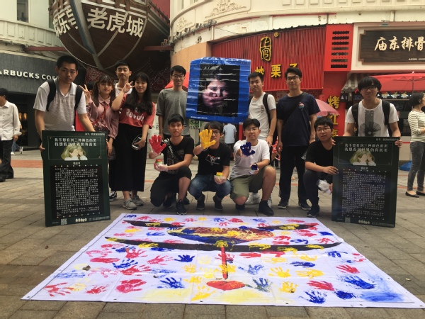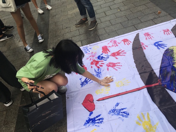 此次倡议活动共有信息科学与技术学院的13名志愿者参与,现场除发放倡议书外,还有“小演员”模仿红黄蓝虐童案进行的行为艺术,吸引了200多名市民与游客的关注,并且大家纷纷在我们活动的幕布上按下了自己的手印,加入保护儿童的行列并为举办这场倡议活动的志愿者应援。同时,为了提升更多人的保护儿童的意识,加入保护儿童的行列,本次街头活动还设置了现场直播,吸引了1000余人次观看。