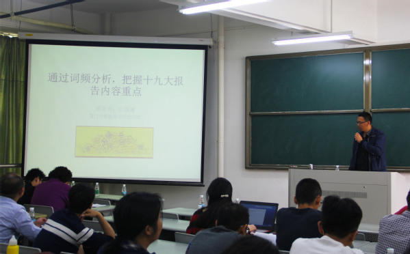 2018年4月18日中午12:30,信息科学与技术学院教工第一、第二党支部于理工305A开展了一场主题为“通过词频分析,把握十九大报告内容重点”的党课,本次党课由信息科学与技术学院张盈谦教授主讲,并邀请音乐系教工党支部的同志一起参与,并于党课后一起讨论了如何开展形式多样的微党课来庆祝改革开放四十周年。