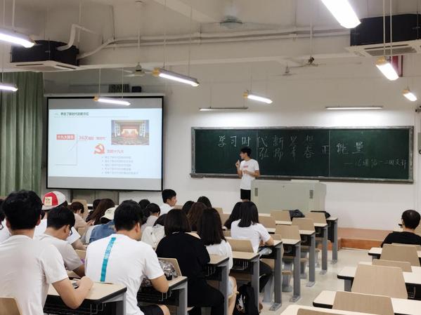 2018年5月17日晚,信息科学与技术学院2016级通信工程团支部于主楼群4号楼311教室进行了以“学习时代新思想 弘扬青春正能量”为主题的团课班会。班会以三个部分组成——解读十九大、诵读《红船梦》、学习习近平总书记在党的十九大中的十九条经典语录。
