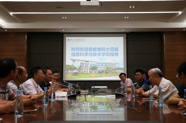 信息科学与技术学院院长夏靖波教授向吴宏鑫院士介绍了信息科学与技术学院的专业设置、师资力量、学生情况、科研和竞赛成果等,汇报了正在申请设立的人工智能专业和机器人工程专业的筹备情况。