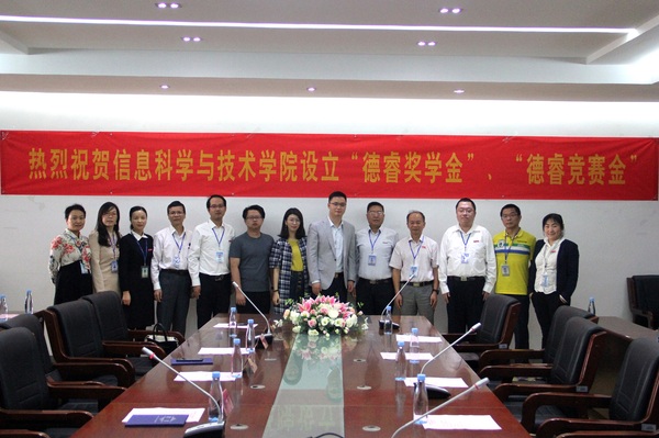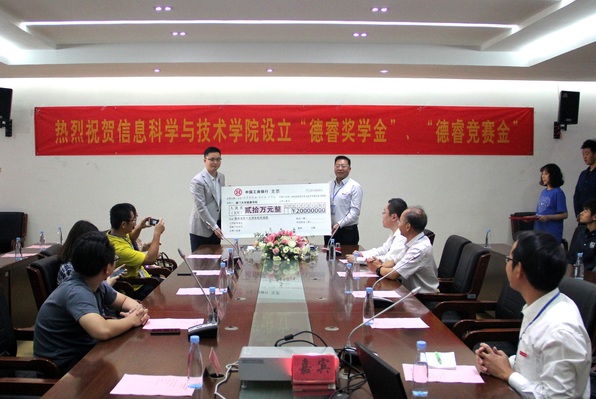 2018年10月20日上午8点,厦门大学嘉庚学院十五周年校庆当日,信息科学与技术学院于理工楼203会议室举办“德睿奖学金”和“德睿竞赛金”签约仪式。参加本次签约仪式的有信息科学与技术学院院长夏靖波教授,副院长刘宝林教授、郭一晶副教授,党总支书记林斌副教授,校友汤俊生、苏令相,以及信息科学与技术学院的教师与学生代表。