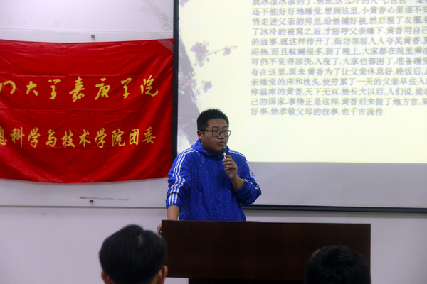 在这个快生活的节奏下,把传统文化有所选择地带入我们的生活显得格外重要。初群易同学把二十四孝图投放大屏幕,着重选择了“黄香温席”这个故事与我们分享,并邀请了一位志愿者同学来朗读这个故事。黄香年方九岁之时,便已知事亲之理。炎炎夏日的时候,扇凉席,驱蚊虫;严寒冬日的时候,以身暖卧。黄香温席的故事反映出一个孩子细致、纯真的孝心,这是一个孩子从内心深处自然萌发、出来的孝,又是出于天性的、尽自己的能力所能做到的孝行。是我们学习的榜样。要知道,父母养育我们的不易。