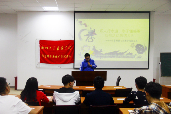 为了弘扬中华民族的孝道文化,信息科学与技术学院团总支开展了“嘉人行孝道,学子懂感恩”系列秋季感恩主题活动,并于10月23日中午12时30分,在理工楼210会议室举行了“嘉人行孝道,学子懂感恩”系列活动总结大会,团总支指导老师史扬出席了本次总结会。