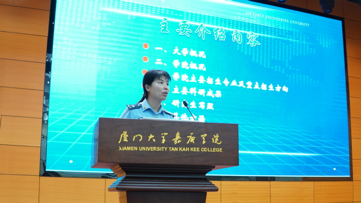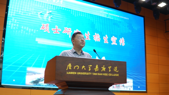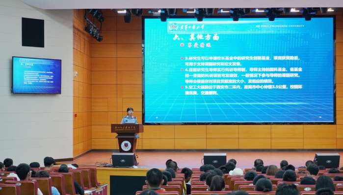 我校信息科学与技术学院夏靖波院长首先致辞,对空军工程大学到我校进行硕士研究生招生宣讲表示热烈欢迎,并简要介绍了空军工程大学的主要情况。空军工程大学是全国重点大学、全军重点建设的五所综合大学之一,承担着空军70%的研究生培养任务,空军工程大学担负着培养空军高层次工程技术人才、指挥军官及培训外军留学生的任务,并长期为地方培养无军籍硕士研究生。夏靖波院长希望在场的同学珍惜这次机会,通过宣讲了解空军工程大学硕士研究生招生政策,为将来考研做好准备。