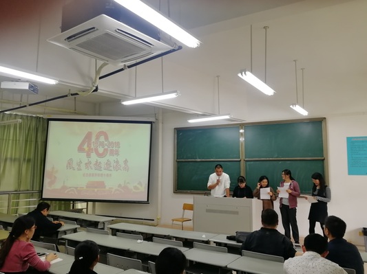 来自信息科学与技术学院教工第一党支部的任欢、葛冯敏、连丽红、邱雪莲、陈晓玉五位同志带来了主题为“40年一路辉煌”的诗歌朗诵。“四十年前,如果不是改革开放,今天的中国,在世界面前,那将会是什么模样”。朗诵铿锵有力,抑扬顿挫,展现了改革开放40年来,中国人民取得的辉煌成就,激励党员们在新的历史时期,不忘初心、牢记使命,自觉把个人理想融入到国家改革与发展的伟业,在自身的工作岗位上积极发挥先锋模范作用。