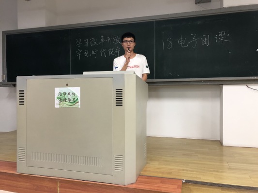 伴随着PPT放映响起的音乐,主讲人18电子团支书陈航同学宣布“学习改革开放,牢记时代使命”团课正式开始。在团课伊始,首先向大家提出了“一代人要有一代人使命,青年人要有青年人的担当”的观点,引出了今年为改革开放40周年的主题。