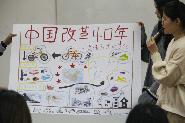 陈慧芳和郑君星两个小组从“海陆空”科技的变化入手,展示了科学技术是第一生产力的硬道理,讲述了40年来我国科技发展日新月异,“辽宁舰”、“和谐号”、“天宫一号”我国在海陆空三方面取得了巨大发展,改革开放40年织就海陆空交通网路新时代。