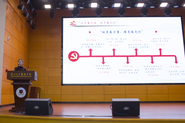 在宣讲结束后团委副书记唐文婧老师上台对本次活动进行了点评总结。唐老师首先肯定了本次活动的成果,并鼓励同学们积极进取,传承精神,从中提升自我。
