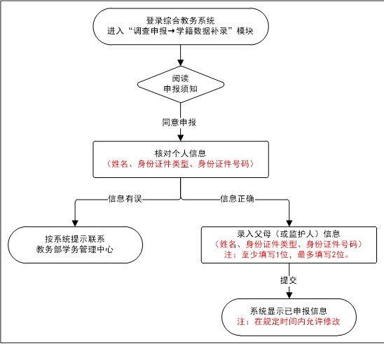 即日起至3月6日24:00,学生本人登录我校综合教务系统,进入“调查申报→学籍数据补录”模块,根据系统提示操作。 申报流程如下图: