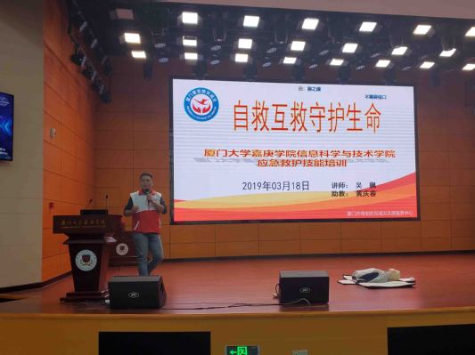 3月18日中午于公一#101多功能报告厅举行应急救护知识和技能培训讲座,邀请到厦门鹭安防灾减灾志愿服务中心主任、厦门红十字应急救护师资吴飙老师为我们进行讲解与培训,培训内容包括心肺复苏术(CPR)、自动体外除颤仪(AED)、海姆立克急救法等。我院院长夏靖波教授和专任教师杜小甫老师也出席了本次讲座。