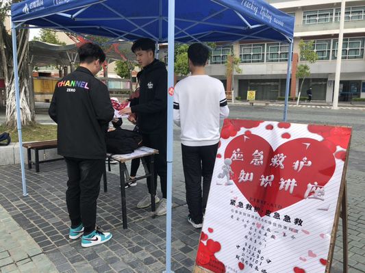 3月15日-17日中午在北区广场进行班级公益行的第一项活动应急救护知识和技能培训讲座的宣传,由班委带领班级同学一起摆摊、发放传单、介绍本次活动。