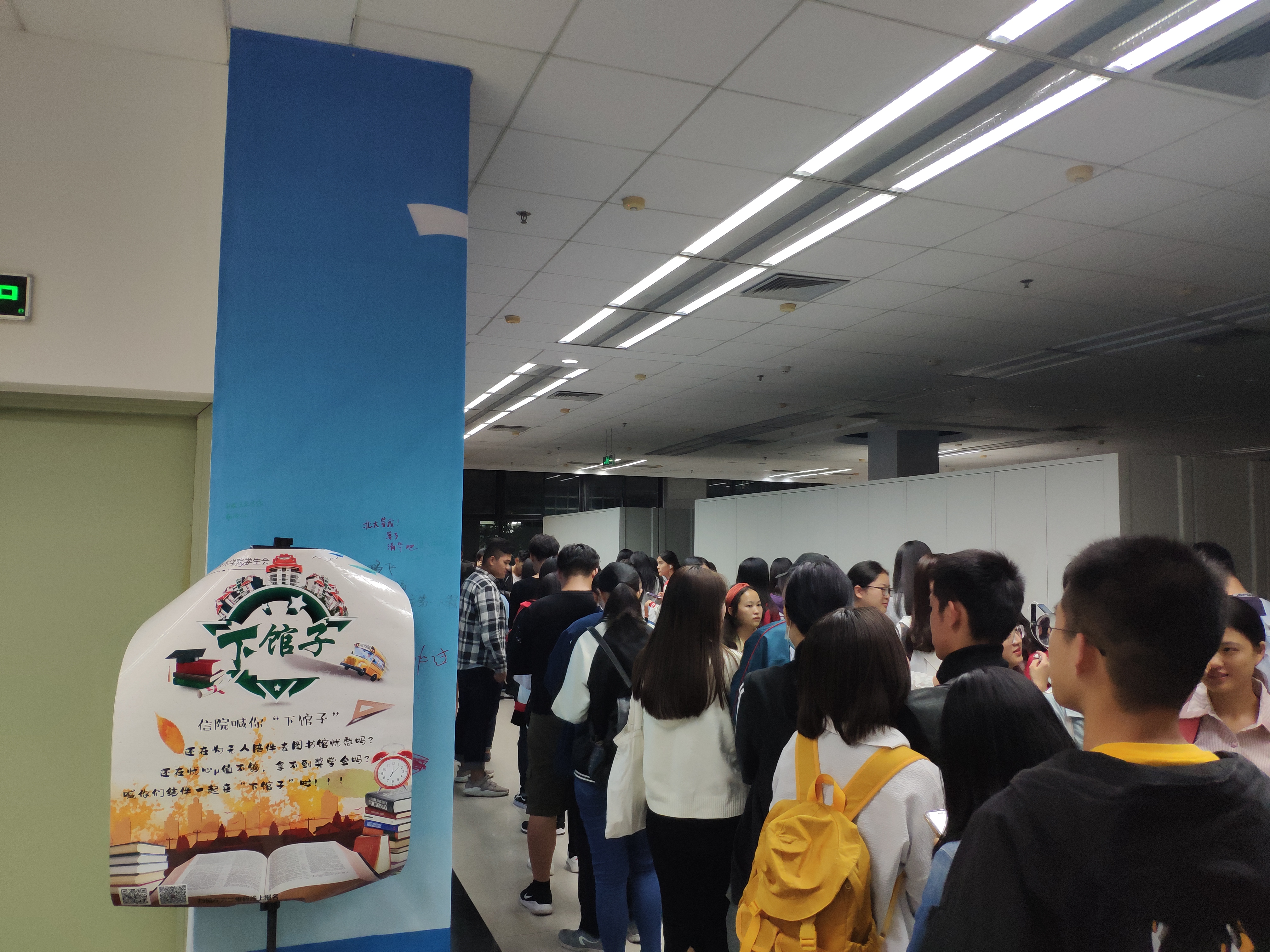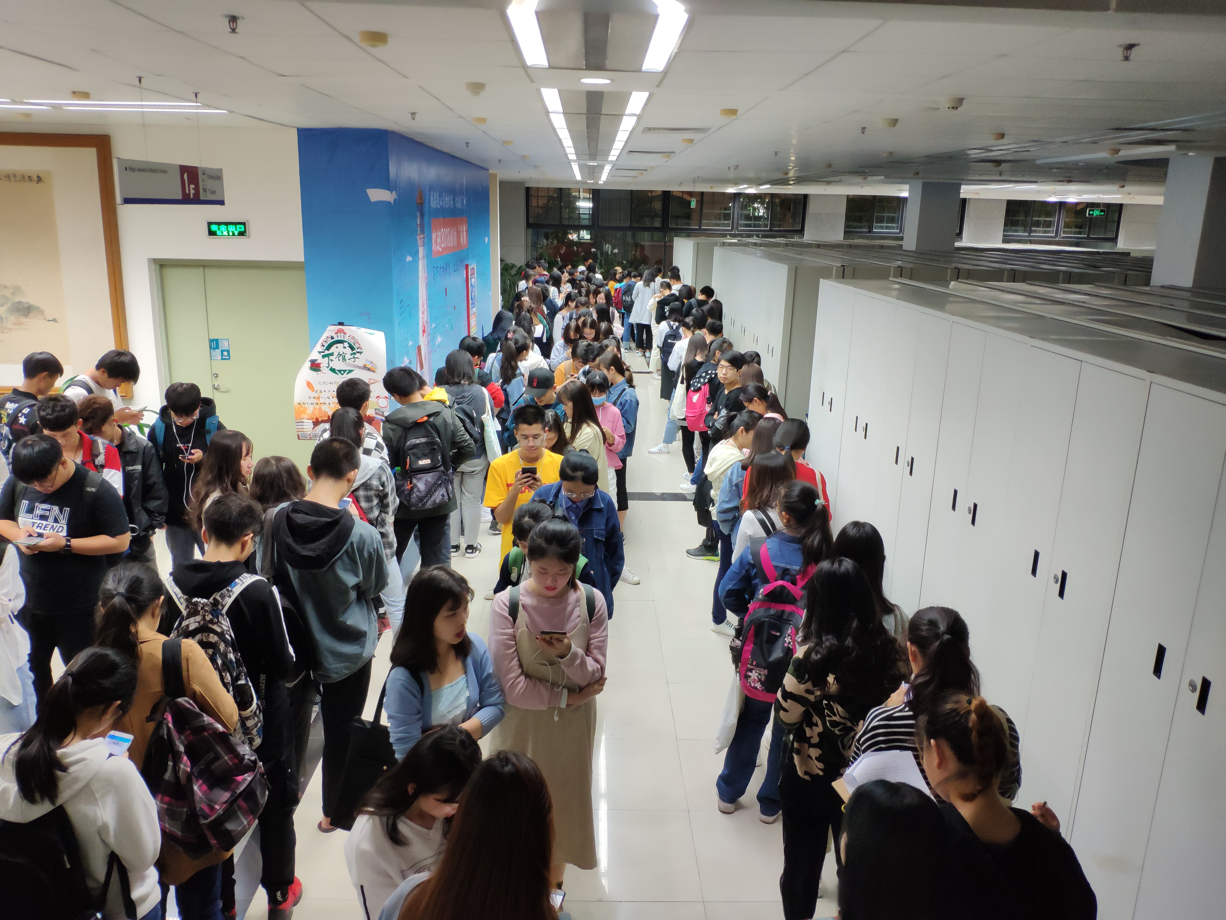 活动开始的第一周,和以往一样是μ值加倍,经过工作人员的引导,来签到的同学在排队过程中始终遵守图书馆的纪律。由于签到人数居多,导致排队签到的时间过长,同学在排队的时候也不忘拿起书本学习。