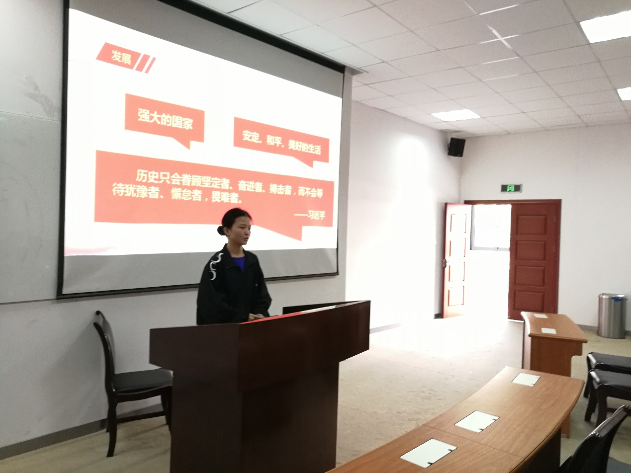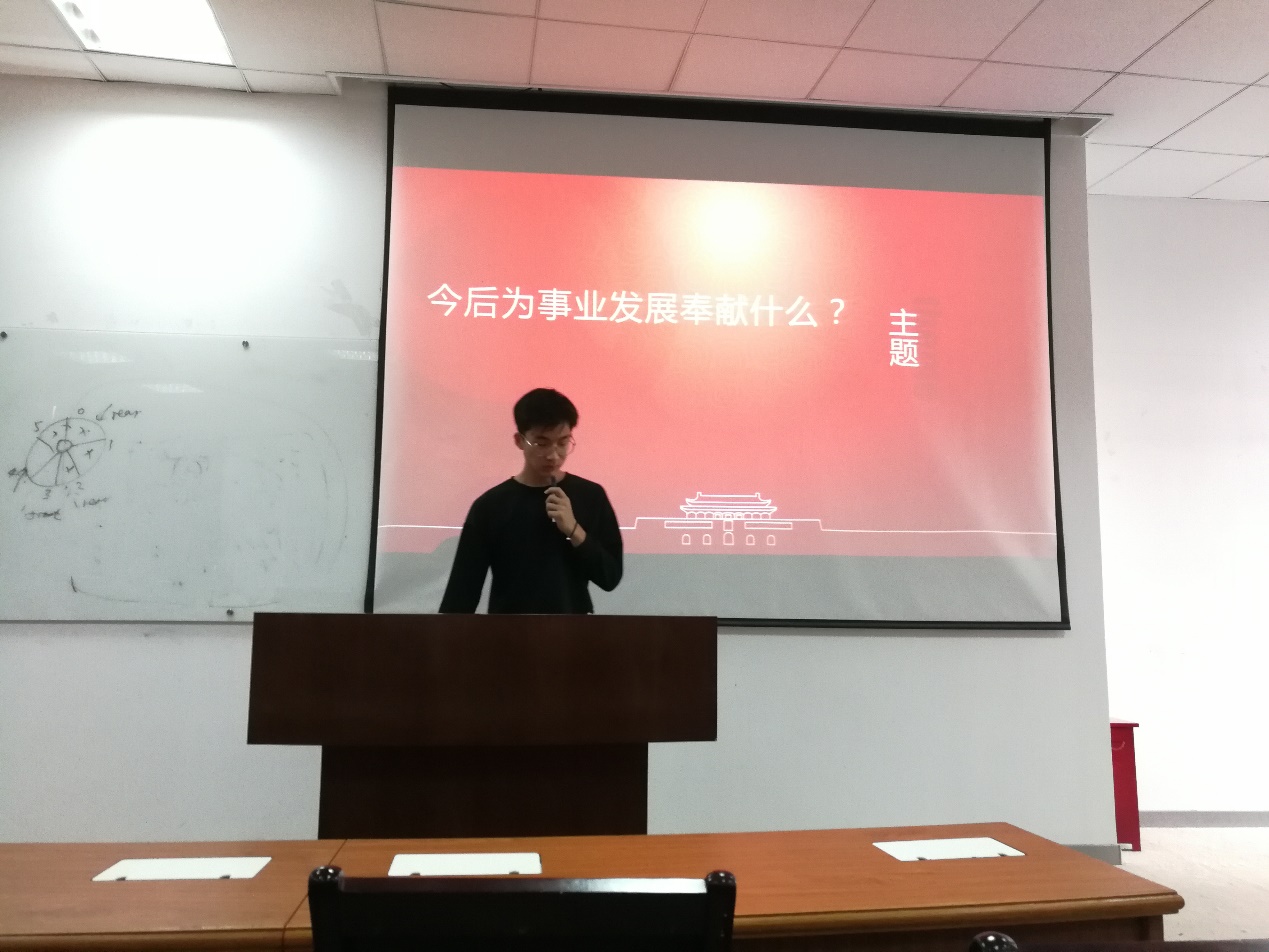 杨少杰同学以“当代大学生的使命与担当”为主题,他指出周恩来是为中华之崛起而读书,作为新时代的大学生党员应当学好专业知识,练好自身本领,坚守初心,勇于担当,将自己的理想和追求融入国家和民族的伟大事业中。