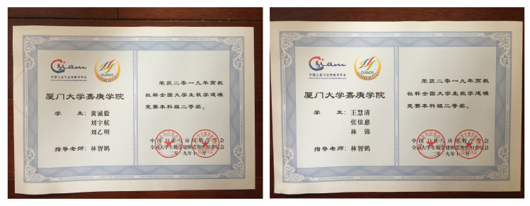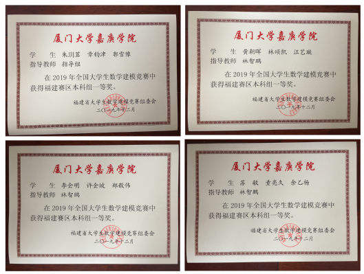 2019年全国大学生数学建模竞赛福建赛区共有来自53所院校(其中本科院校35所、高职高专18所)的1337支参赛队伍参加,其中本科组1212队,专科组125队。2019年全国大学生数学建模竞赛我校一共派出25支队伍参加比赛,共有11支队伍获奖,获得了全国二等奖2项,获奖比例8%(平均获奖比例为3.38%),福建省一等奖4项,获奖比例16%(平均获奖比例为14.38%),省二等奖5项,获奖比例20%(平均获奖比例为19.05%)。总获奖比例44%(平均获奖比例33%),其中获得国奖比例排在第二名,在厦门大学跟福州大学前面,领先于其它同类高校;获得省一等奖的比例仅次于厦门大学跟福州大学两个双一流学科建设学校,本次比赛获奖队伍数创历史新高,同时获得高级别奖项的队伍数也是在近十年来最多的,因此2019年全国大学生数学建模竞赛成绩无论从获奖队数还是获奖层次来看都取得了突破。