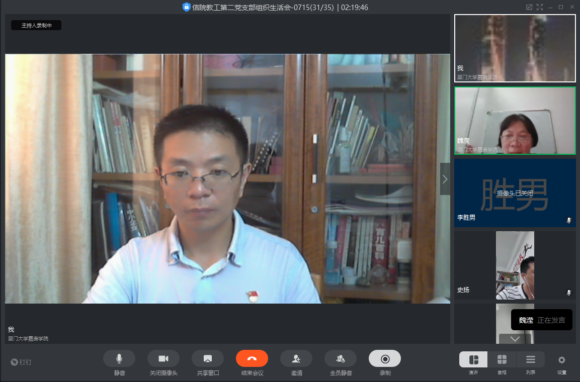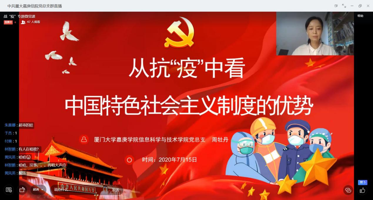 2020年7月15日中午,信息科学与技术学院教工党支部全体党员,通过钉钉群直播的形式开展了一场战“疫”专题党课,以视频会议的形式组织了一场“战役故事”组织生活会。