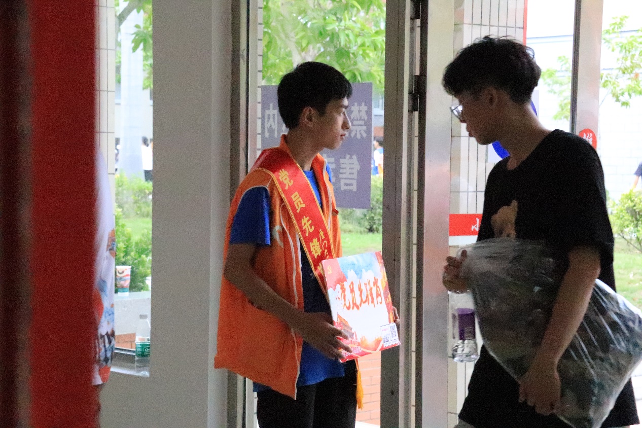 在此次的迎新工作中,有着一道不可忽略的靓丽风景线,那就是我们的“先锋党员”。他们身披红绶带,佩戴党徽,积极奋战在迎新工作的一线。他们顶着暑气,热情又耐心地为新生们解答一个又一个的问题,为他们提供最为贴心的服务。