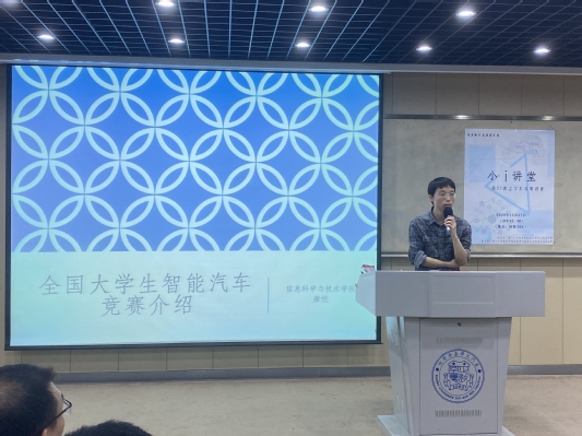 然后,康恺老师结合视频向大家讲解了智能车竞赛的竞赛形式和竞赛过程,并详细讲解了智能车竞赛的车模类型、赛道元素、组织形式、课程基础等。康恺老师强调,参加学科竞赛的同学一定要培养肯于钻研的精神和团队合作的能力,并掌握好专业理论基础和技术能力。