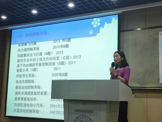 随后,周牡丹老师介绍了全国大学生机器人大赛和全国大学生电子设计竞赛,包括比赛内容和形式、我院历年获奖情况等,并通过多段视频向大家直观地展示了往届优秀学长的电子设计竞赛作品和机器人大赛的竞赛过程。周牡丹老师强调,我们各项竞赛之间是相互关联的,可以进行成果的衔接和进一步提升,形成积累,增强传承。