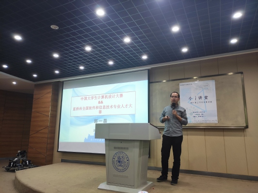 首先,郭一晶副院长从大赛现况、我校历年参赛和获奖情况等方面对中国大学生计算机设计大赛、全国软件和信息技术专业人才大赛进行了介绍,并详细讲解了两项比赛的参赛形式、比赛内容、竞赛过程等。郭一晶副院长表示我院为学生提供学科竞赛、创新项目、产学研项目、共建实验室、实习基地等多个平台,希望大家都能积极参与进来,在学科竞赛和科研创新活动中不断提高自己的专业水平和创新能力。