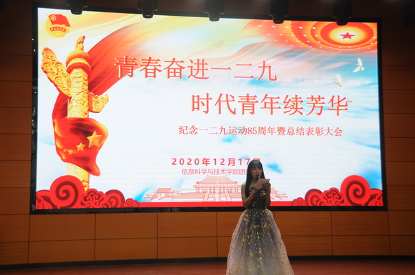 “一二·九”运动展现了中国革命历史进程一批有作为、有理想的中国青年,为进一步激发学生的爱国热情,大力弘扬中华民族热爱祖国、崇尚团结、追求统一、爱好和平的民族精神,12月17日中午,信息科学与技术学院(以下简称“信息学院”)团委在公共教学楼一号楼101举行“青春奋进一二九,时代青年续芳华” 纪念“一二·九”运动85周年暨总结表彰大会。