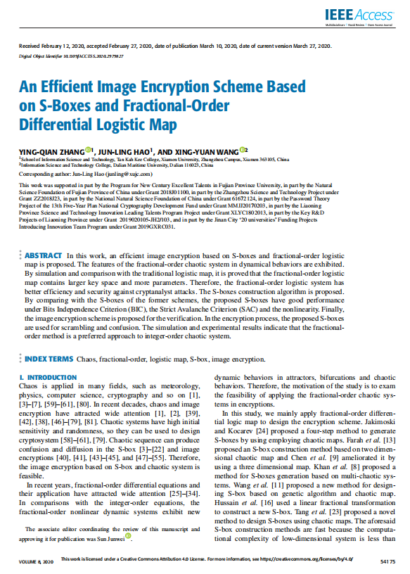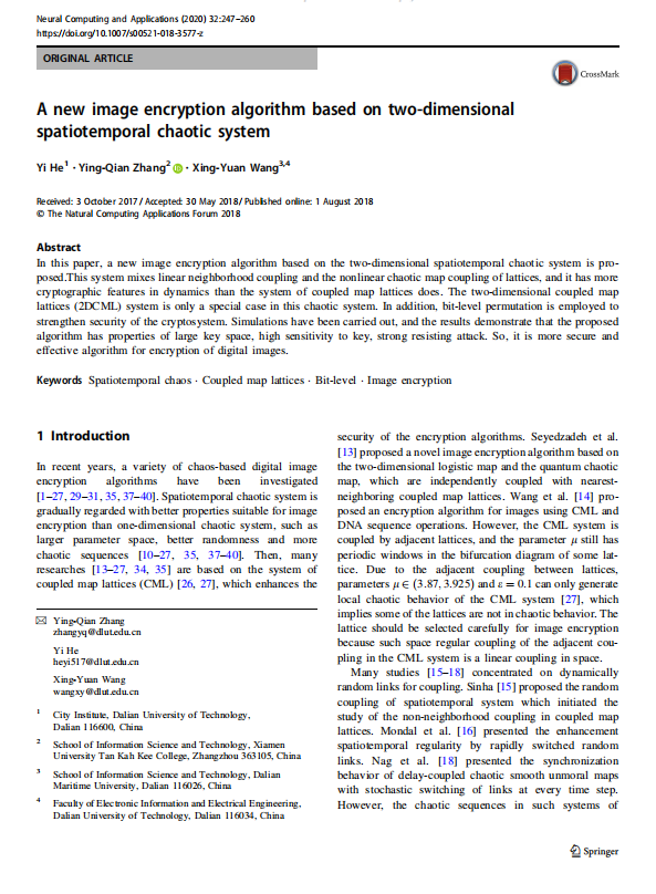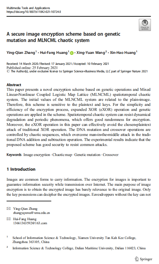 2021年2月,信息科学与技术学院张盈谦教授与团队成员青年教师黄慧芳、19届软件专业本科生黄欣浩等合作,在国际高水平期刊MULTIMEDIA TOOLS AND APPLICATIONS上发表文章A secure image encryption scheme based on genetic mutation and MLNCML chaotic system,主要研究利用时空混沌理论提出数字图像加密的新技术,重点解决基于图像的隐私保护问题,已被“SCI核心库”收录。