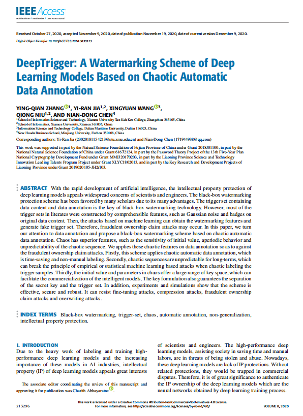近两年,张盈谦教授科研团队已在信息与智能安全领域的国际高水平期刊上发表四篇论文。其中,2020年1月,张教授与大连海事大学王兴元教授、大连理工大学城市学院何毅教授合作研究基于图像加密的隐私安全问题,在NEURAL COMPUTING & APPLICATIONS期刊发表文章A new image encryption algorithm based on two-dimensional spatiotemporal chaotic system,该论文被“ESI高被引”收录;2020年2月,张教授与团队成员青年教师郝俊灵等合作研究分数阶微分图像加密技术,在IEEE ACCESS期刊发表文章An Efficient Image Encryption Scheme Based on S-Boxes and Fractional-Order Differential Logistic Map;2020年11月,张教授与团队成员18级硕士生贾贻然、19届通信专业本科生牛琼等合作研究深度学习模型嵌入和提取水印,在IEEE ACCESS期刊发表文章DeepTrigger:A Watermarking Scheme of Deep Learning Models Based on Chaotic Automatic Data Annotation。此外,据Web of Science检索结果显示,张盈谦教授ESI高被引收录论文已有6篇。