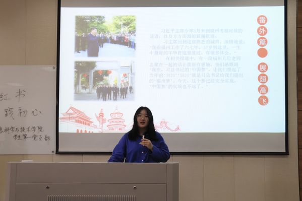 新中国成立后,党带领全国人民不断探索社会主义建设道路,开启中华民族的伟大复兴之路。1990年,习近平来到福州任福州市委书记,在福州工作了六年。信息与计算科学专业2018级林涵斌以“看福州故事,感受领袖魅力”为主题,为大家介绍了《习近平在福州》。她讲述了福州历年来的发展变化,介绍了习近平如何带领福州人民进行古厝保护和旧城改造,实现“3820”战略发展规划。她表示总书记为福州发展和人民幸福做出重要的贡献,今年3月总书记到福州考察调研,深情牵挂福州的城市规划建设和历史文化街区保护等情况,这进一步使她坚定了信仰、增强了为人民服务的意识。