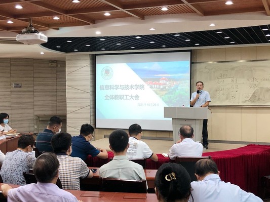 2021年10月21日中午,信息科学与技术学院在经管201召开期中全体教职工大会,会议由夏靖波院长主持。