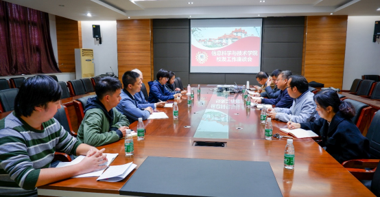 2022年3月7日,鲁同安副院长、校友秘书处秘书长、管理发展与培训中心主任叶志筑、校友秘书处副秘书长王协等人莅临我院调研校友、培训工作。信息科学与技术学院院长夏靖波、副院长郭一晶、党总支书记周牡丹,党总支副书记姚福清等人参与了本次座谈。