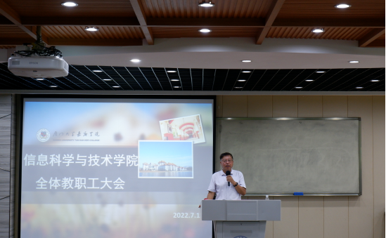 2022年7月13日9:00,在经管#201案例教室,信息科学与技术学院召开期末全体教职工大会,会议由夏靖波院长主持。