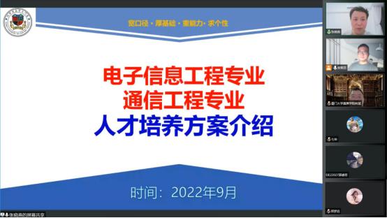 9月5日下午,电子通信教研室在腾讯会议上召开2022级电子信息工程与通信工程专业人才培养方案解读会。教研室张晓燕主任、林斌老师、张朝贤、胡广洲老师参加了此次解读会。