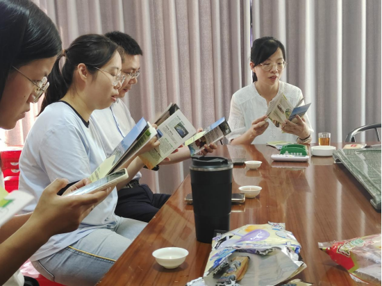 邱丹华拍摄 黄雅荣(右一)、史扬老师(右二)、金贇老师(左二)和实践队队员观看宣传手册