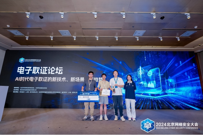 6月5日该项赛事的决赛在国家会议中心盛大举行!全国电子数据取证高手,展开了一场精彩绝伦、智慧碰撞的取证巅峰对决。决赛经过5个小时不间断的比拼,选手们挑战了涵盖手机取证、APK分析、IPA分析、二进制分析、人工智能、计算机取证、服务器取证、数据分析、黑客入侵、区块链溯源等多个热门方向的107道超难题目。比赛采取成绩现场实时公布的方式,公正公开。由厦门大学嘉庚学院网络空间安全协会选拔推荐,王晓东老师指导,陈宏泽(领队)、刁剑琦、王睿贤、许梓杉同学组成的代表队,在比赛中沉着应战,顶住压力,在最后关头排名从一度落后的第21一举压哨逆转到学生组第5,最终以98分的好成绩与哈尔滨工业大学、杭州电子科技大学、中国人民公安大学、西安电子科技大学代表队携手获得一等奖。此次比赛,云集了多支来自国内985、211重点大学以及电子数据取证的专业警察学院代表队,能够在本次赛事中脱颖而出实属不易,尤其是作为入围决赛的唯一民办高校,首次参赛即夺一等奖的壮举也令现场专家赞叹不已,极大地提升了我校在该领域的知名度。