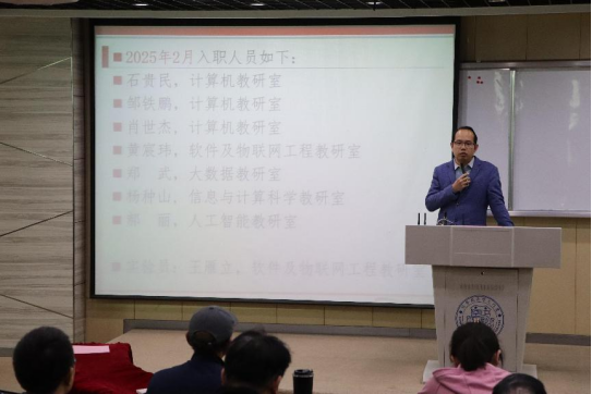 郭一晶副院长首先代表信息学院百余名教职员工,对本学期新入职的位新教师表示了欢迎,希望新教师们在教学、科研、服务上都能有较好的表现接着就上学期信息学院开展的教学竞赛、教改思政立项、转专业等各项工作进行总结,然后对本学期新开设课程、毕业设计、毕业实习、学生诚信考试等工作提出具体的要求。此外,郭院长强调安全稳定工作要常抓不懈,全体教职员工要自觉遵守学院各项规章制度,提高安全意识,在教学和科研工作中要重视政治安全、人身安全和实验室安全,各级安全工作责任人和安全工作负责人要各司其职,担起责任。